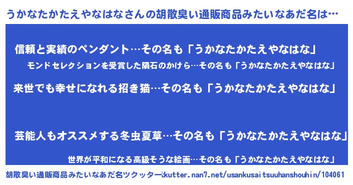 | 男性向けラノベタイトル風あだ名 | 『うかなたかたえやなはなという概念が存在しない退屈な世界 』 |