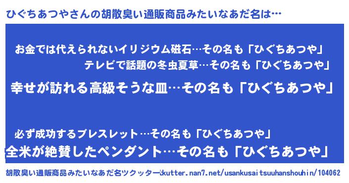 | 男性向けラノベタイトル風あだ名 | 『やはりひぐちあつやの青春ラブコメはまちがっている 』 |