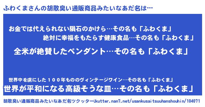 | 男性向けラノベタイトル風あだ名 | 『ふわくまの嫁は女の子じゃないと思った?』 |