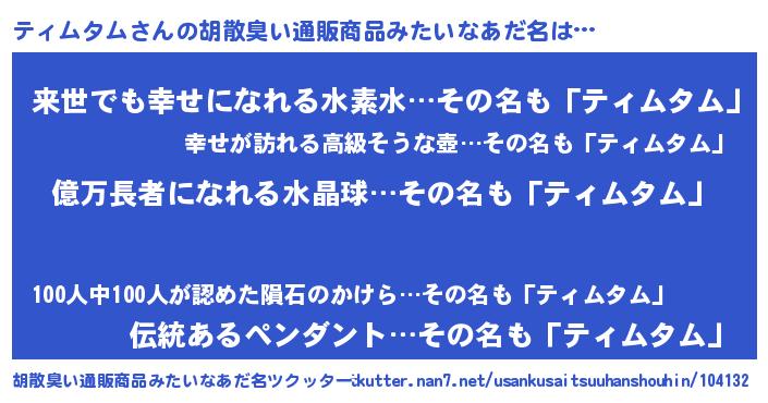 | 男性向けラノベタイトル風あだ名 | 『ティムタム~年齢イコール彼女いない歴の魔法使い~』 |