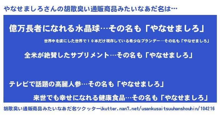 | 男性向けラノベタイトル風あだ名 | 『やなせましろの嫁は女の子じゃないと思った?』 |