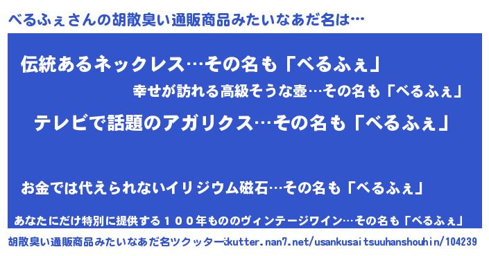 | ヘコむあだ名 | 『べるっぺ』『なまこ酢』『べるにー』 |