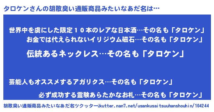 | 男性向けラノベタイトル風あだ名 | 『転生したらタロケンだった件』 |
