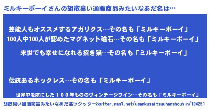 | 男性向けラノベタイトル風あだ名 | 『ミルキーボーイという概念が存在しない退屈な世界 』 |