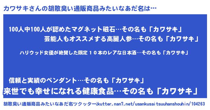 | ヘコむあだ名 | 『カワサキ(笑)』『カワお』 |