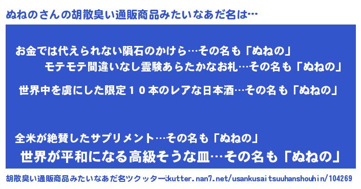 | 意味不明あだ名 | 『住所不定無職ぬねの(47歳)』 |