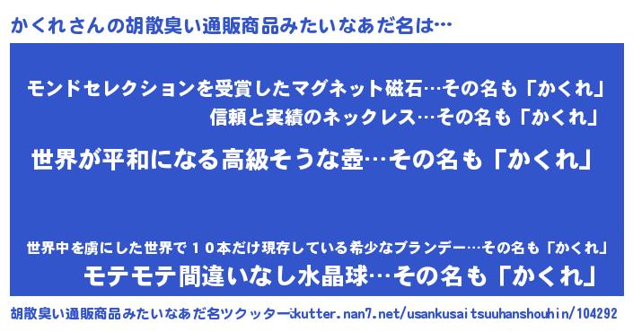 | ヒーロー風カッコイイあだ名 | 『ウルトラかくれマン』『スーパーカクレ』 |