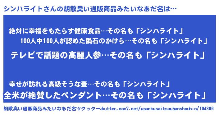 | 男性向けラノベタイトル風あだ名 | 『Re:シンハライトから始める異世界生活』 |