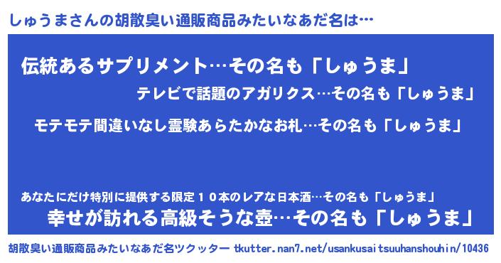 | 意味不明あだ名 | 『ペロリンしゅうま』『自称しゅうま』 |