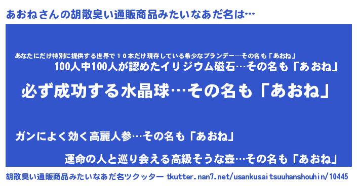 | 男性向けラノベタイトル風あだ名 | 『アオネスレイヤー』『魔弾の王とあおね』 |