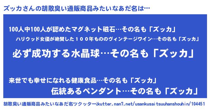 | 男性向けラノベタイトル風あだ名 | 『ズッカの憂鬱』『魔弾の王とズッカ』 |