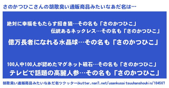 | 肩書あだ名 | 『さのかつひこ店長』『さのかつひこ中佐』 |