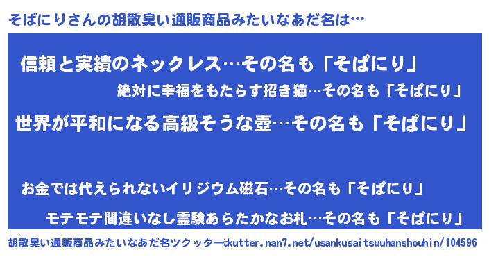 | 男性向けラノベタイトル風あだ名 | 『転生したらそぱにりだった件』 |