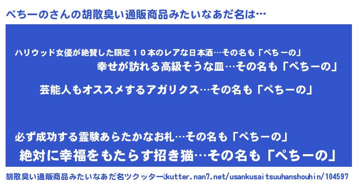 | 男性向けラノベタイトル風あだ名 | 『ぺちーの~年齢イコール彼女いない歴の魔法使い~』 |