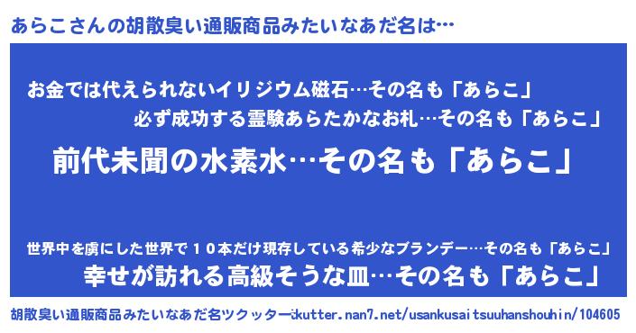 | 男性向けラノベタイトル風あだ名 | 『うちのあらこが世界を掌握している!』 |