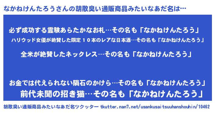 | 男性向けラノベタイトル風あだ名 | 『なかねけんたろう~年齢イコール彼女いない歴の魔法使い~』 |