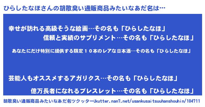 | 男性向けラノベタイトル風あだ名 | 『この素晴らしい世界にひらしたなほを!』 |