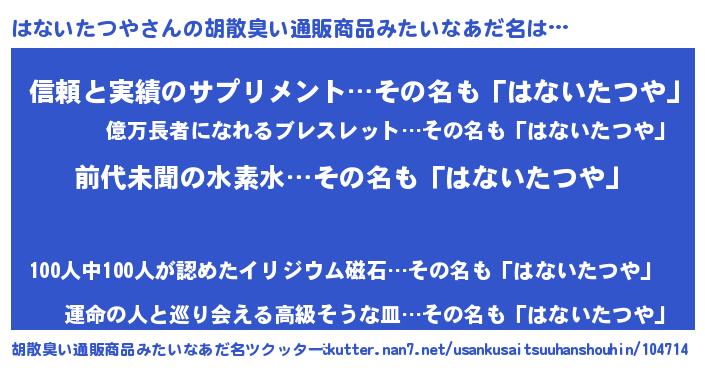 | 肩書あだ名 | 『はないたつや中将』『はないたつや教頭』 |