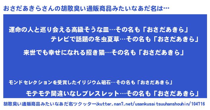 | ヘコむあだ名 | 『おさだあきら(小並感)』『酢こんぶ』 |