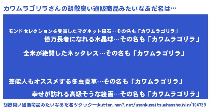 | 男性向けラノベタイトル風あだ名 | 『カワムラゴリラの嫁は女の子じゃないと思った?』 |