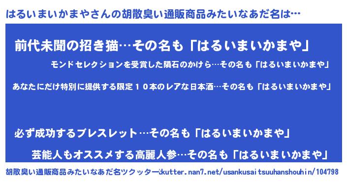 | 意味不明あだ名 | 『住所不定無職はるいまいかまや(47歳)』 |