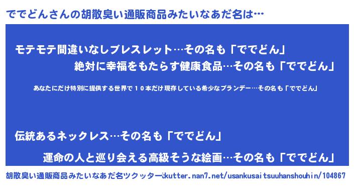| 男性向けラノベタイトル風あだ名 | 『ででどん~年齢イコール彼女いない歴の魔法使い~』 |