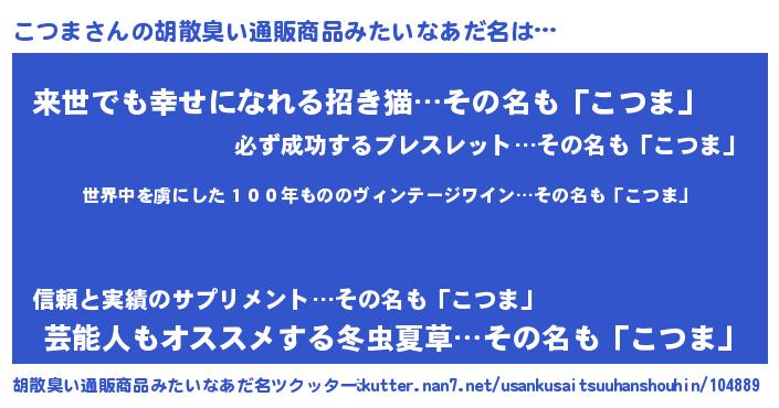 | 女子向けラノベタイトル風あだ名 | 『乙女ゲームの破滅フラグしかない悪役こつまに転生してしまった…』 |