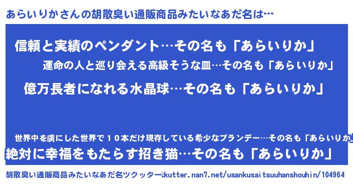| 男性向けラノベタイトル風あだ名 | 『あらいりかに滅ぼされるだけの簡単なお仕事です』 |