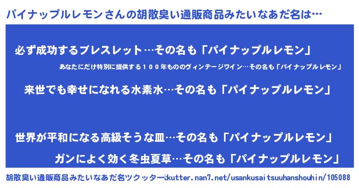 | 男性向けラノベタイトル風あだ名 | 『パイナップルレモンという概念が存在しない退屈な世界 』 |