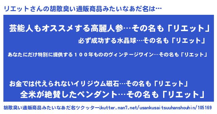 | 意味不明あだ名 | 『住所不定無職リエット(10歳)』 |