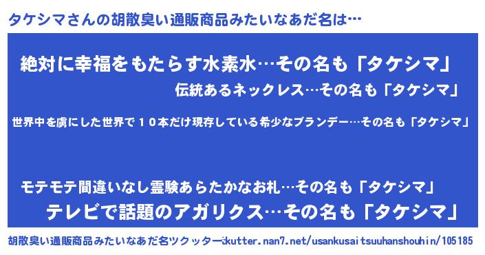 | ヘコむあだ名 | 『タケシマ(震え声)』『タケぷりん』 |