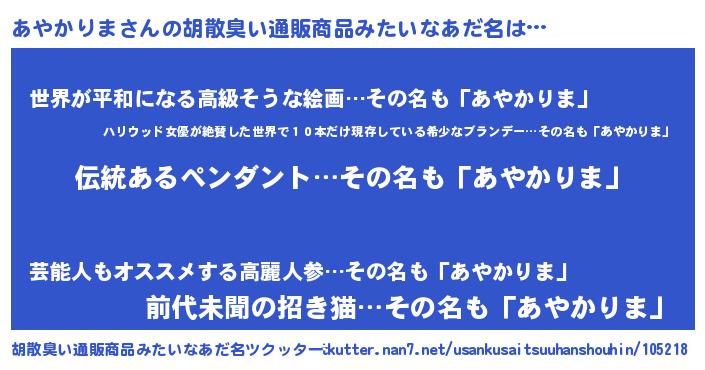 | ヘコむあだ名 | 『あやぷりん』『なまこ酢』 |