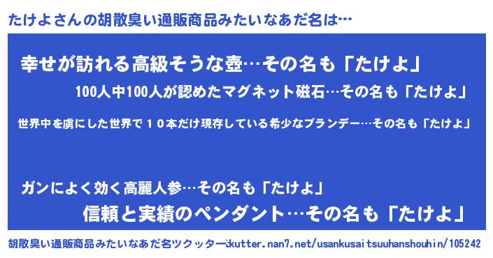 | 意味不明あだ名 | 『住所不定無職たけよ(89歳)』 |