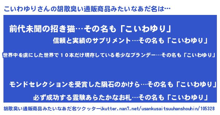 | 意味不明あだ名 | 『住所不定無職こいわゆり(91歳)』 |