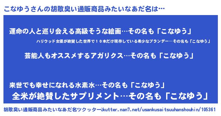 | 女子向けラノベタイトル風あだ名 | 『闇のこなゆう』『こなゆうの雑貨屋さん』 |