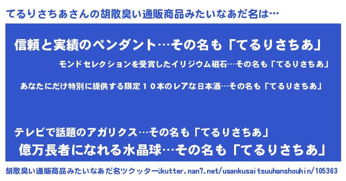 | 意味不明あだ名 | 『住所不定無職てるりさちあ(39歳)』 |