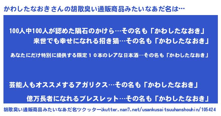 | 意味不明あだ名 | 『住所不定無職かわしたなおき(59歳)』 |