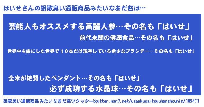 | 意味不明あだ名 | 『住所不定無職はいせ(98歳)』『自称はいせ』 |
