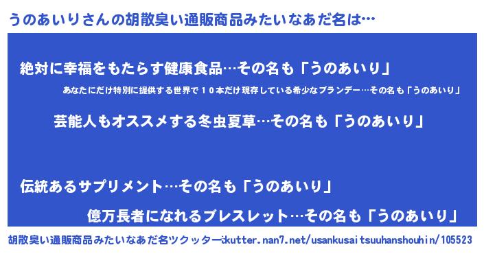 | 意味不明あだ名 | 『自称うのあいり』『永久保存うのあいり』 |