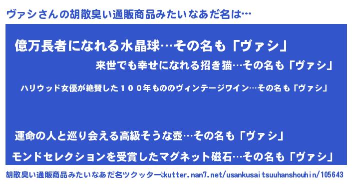 | 男性向けラノベタイトル風あだ名 | 『魔弾の王とヴァシ』『ヴァシスレイヤー』 |