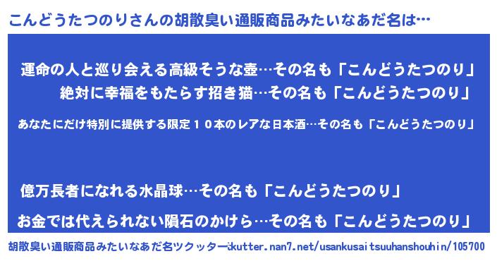 | 男性向けラノベタイトル風あだ名 | 『この素晴らしい世界にこんどうたつのりを!』 |