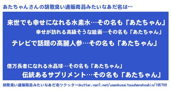 | 意味不明あだ名 | 『自称あたちゃん』『永久保存あたちゃん』 |