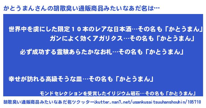 | 男性向けラノベタイトル風あだ名 | 『かとうまんの憂鬱』 |