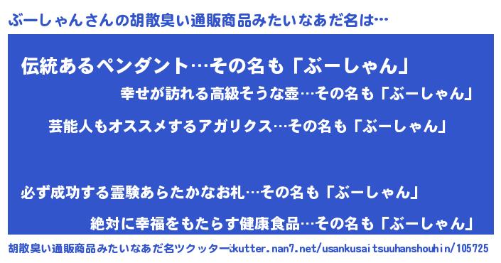 | 男性向けラノベタイトル風あだ名 | 『Re:ぶーしゃんから始める異世界生活』 |