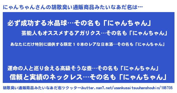 | 意味不明あだ名 | 『住所不定無職にゃんちゃん(53歳)』 |