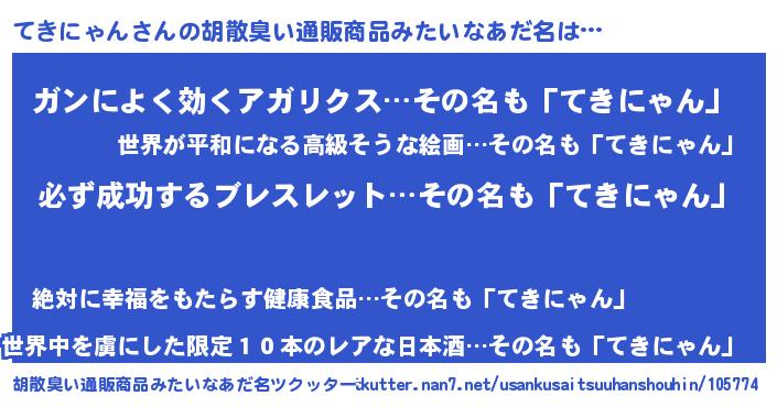 | 男性向けラノベタイトル風あだ名 | 『てきにゃんの憂鬱』 |