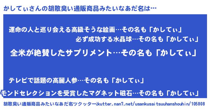 | 男性向けラノベタイトル風あだ名 | 『かしてぃの嫁は女の子じゃないと思った?』 |