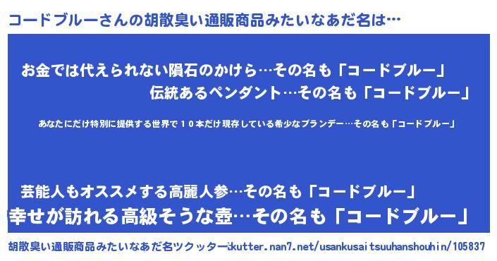 | 男性向けラノベタイトル風あだ名 | 『この素晴らしい世界にコードブルーを!』 |