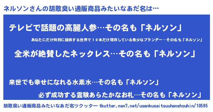 | 男性向けラノベタイトル風あだ名 | 『ネルソンの嫁は女の子じゃないと思った?』 |