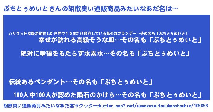 | 男性向けラノベタイトル風あだ名 | 『ぷちとぅめいとという概念が存在しない退屈な世界 』 |
